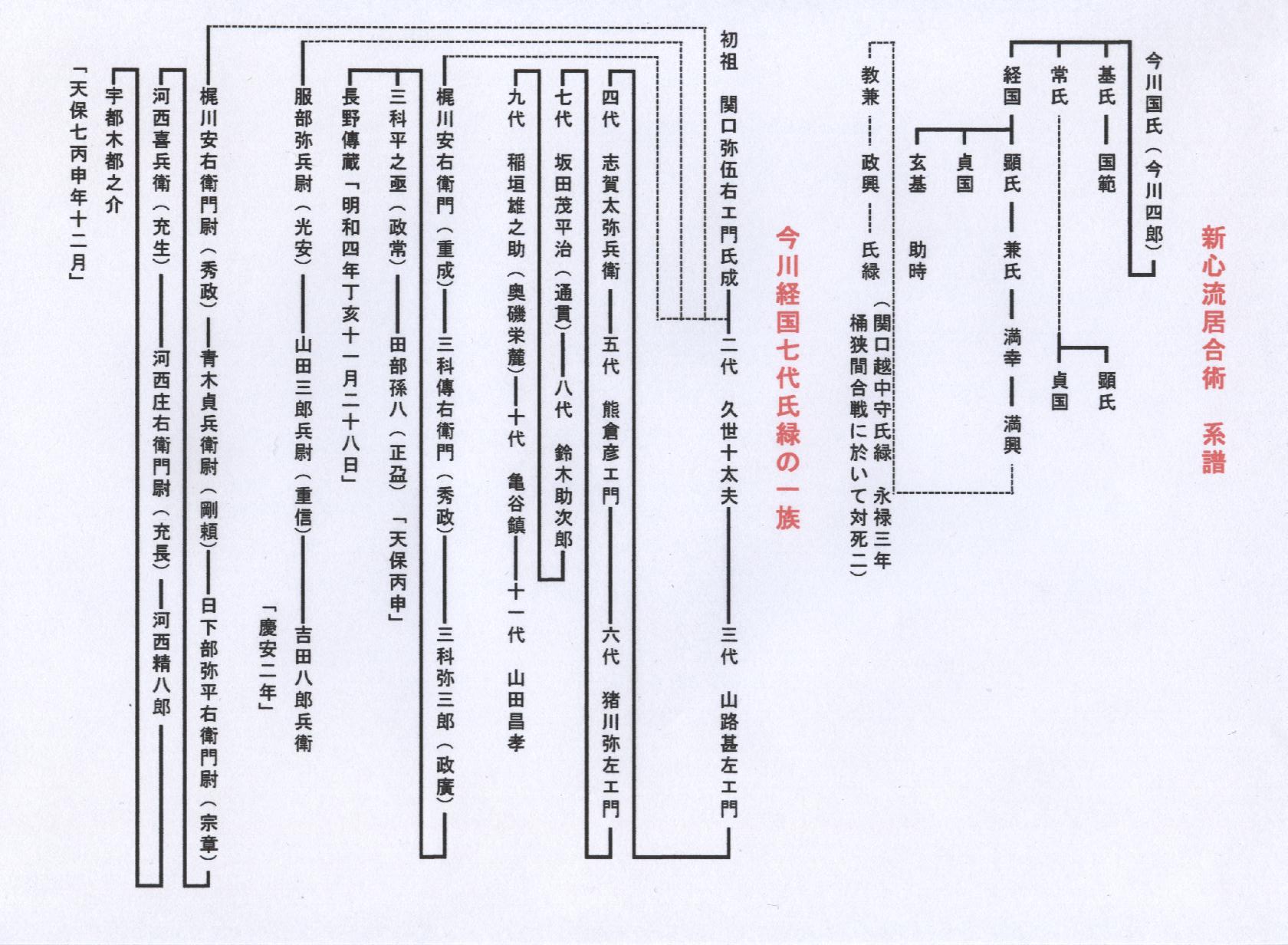 三、熊本関口流の居合剣法は同じとしても江戸新心関口流が古いのか?紀州の関口流の方が古いのか?が問題なのだが、私の推察では先述したように、関口流居合は駿河で発生し柔術は後に紀州徳川の関口流で完成したと思われる。関口氏の発生は、一等資料(尊卑文脈)一等資料(寛永諸家系図伝)(今川家譜)等を参考に関口氏を考えてみたい。 三河足利長氏の子に二男が 今川の祖 国氏、その二男が関口次郎常氏と言い、この家系は続いていないが、五男の関口五郎経国の家系が続きこれが今川の正系で 七代目は花咲城主で関口越中守(行部大輔)氏緑であり、永禄三年今川義元の馬廻衆(旗本 評定衆)として織田信長の桶狭間奇襲で討死にし、ほかに桶狭間には関口を名乗る者が、三名程いる。別に今川の士族に瀬名氏がおりその系累に関口行部小輔氏広がいて義元の妹婿、で弘治三年四月(天王寺屋宗達自会茶湯日記)に関口行部将と言うのは氏広のことであろう。 氏広は永禄五年に自刃している桶狭間にはいなかったので、都にいて義元の上洛を待っていたのであろう。関口流(武芸流派大辞典)に氏広の子に外記氏幸という子がいた?と記されているが、築山殿に兄弟がいたと言う事は、どの系譜にもないので、疑わしいと思われる。しかし、もし、いたとしても紀州関口流につながる問題であって、新心関口流の関口弥伍衛門氏成については関口本流の(越中守氏緑)一族という可能性が考慮される。 というのは、弥伍衛門氏成は、年少ながらたとえば十五、六歳で桶狭間合戦の時にいた可能性を新心流目録から年代的逆算するとその年代にあたる。それについて補足説明すると新心流関口弥伍衛門尉氏成目録には初代氏成二代服部光安、三代山田三郎兵衛とあり三郎兵衛が慶安二年四月吉日に吉田八郎兵衛に目録を伝授している。すべての箇条目録を伝授されるのは江戸後期をみるとだいたい三十歳を過ぎて伝授される所から山田三郎兵衛の三代前の生まれが、ざっと百年前として、天文二十年(一五五一)永禄三年は、九才であり、もう少し前の天文十年代の生まれなれば、桶狭間合戦に出陣していた可能性はここから生まれる。今川一族の評定衆関口越中守氏緑の一族とか、他の関口一族の子として充分考えられるのである。(武芸流派大辞典)によると、天正三年の長篠の戦いの時、長篠城を死守した奥平信正に十七歳で結婚した加納姫に仕えていた云々の関口外記氏幸と弥伍衛門氏成はほぼ同世代でありその孫であるとは考えられない。